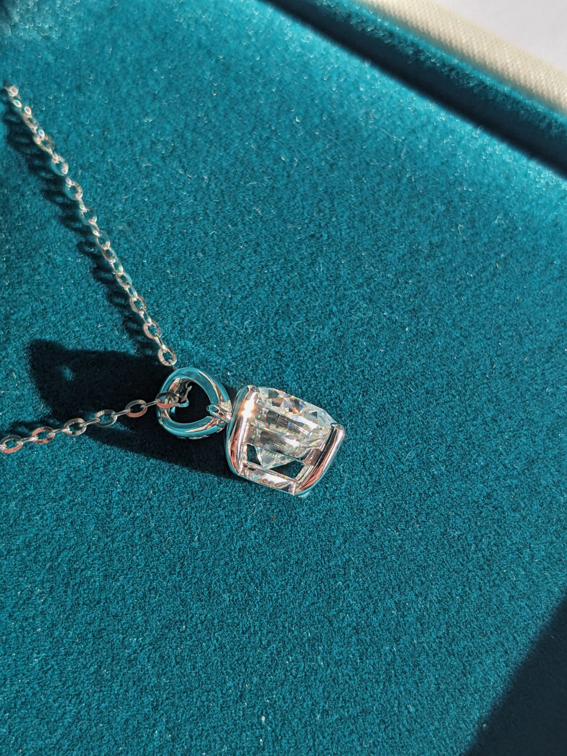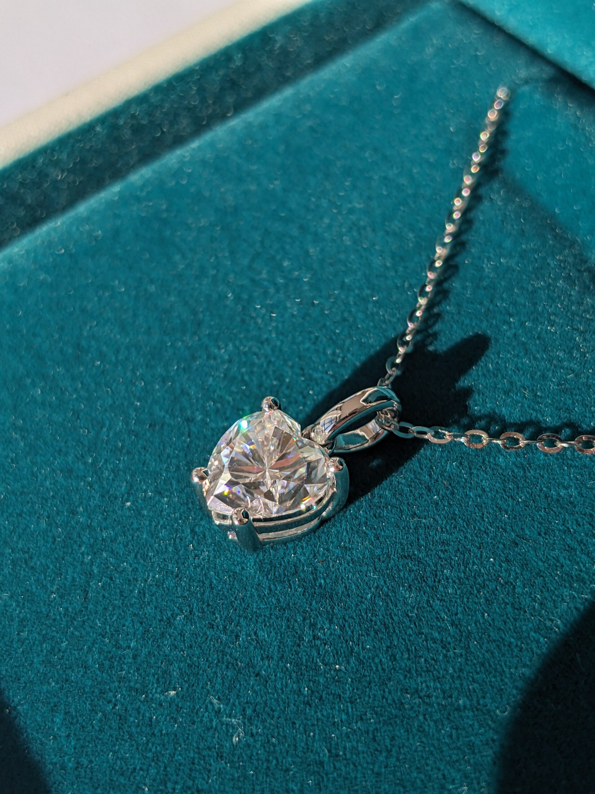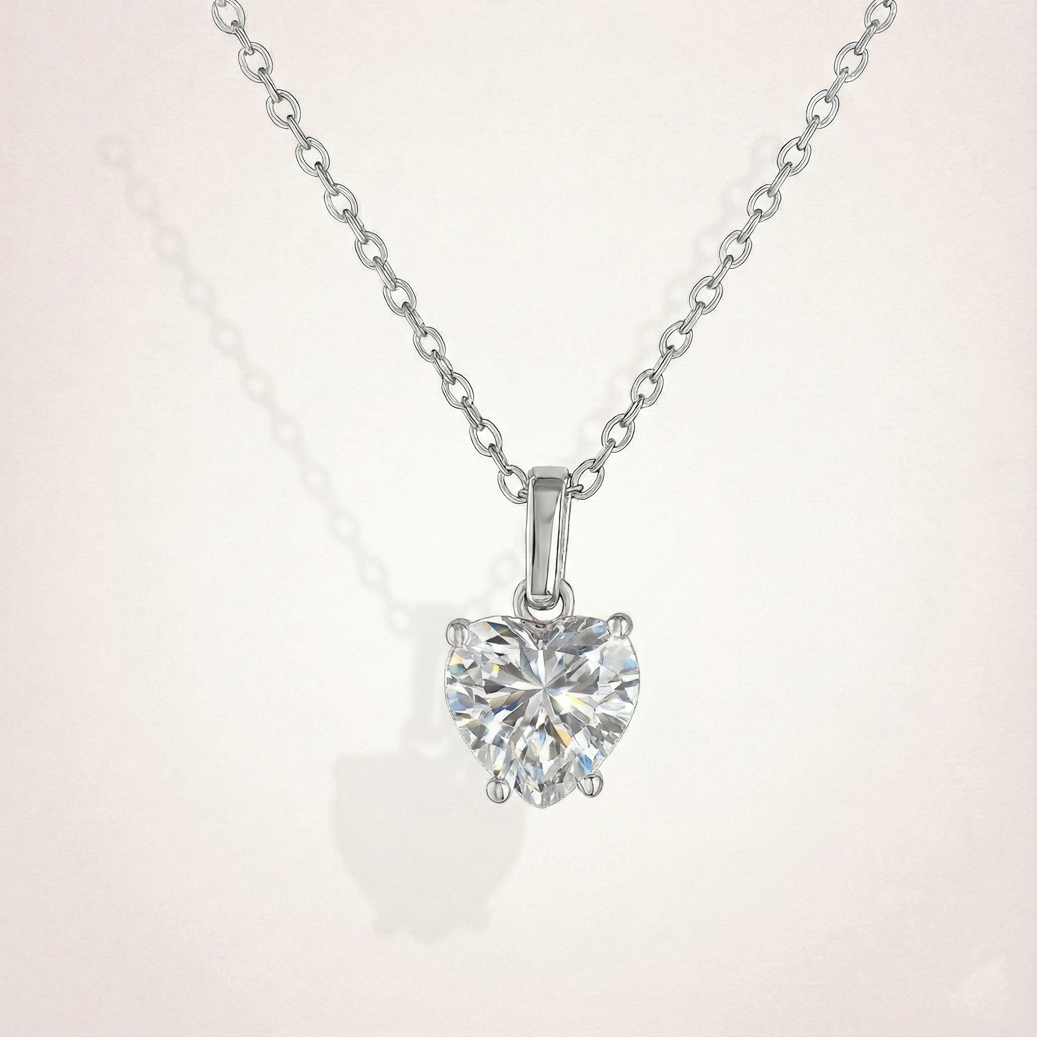 Una moissanita Hughes finamente tallada con forma de corazón engarzada sobre plata rodiada con cuatro puntas.  Su engaste limpio y preciso realza la luminosidad de la gema, creando una pieza refinada, moderna y origina